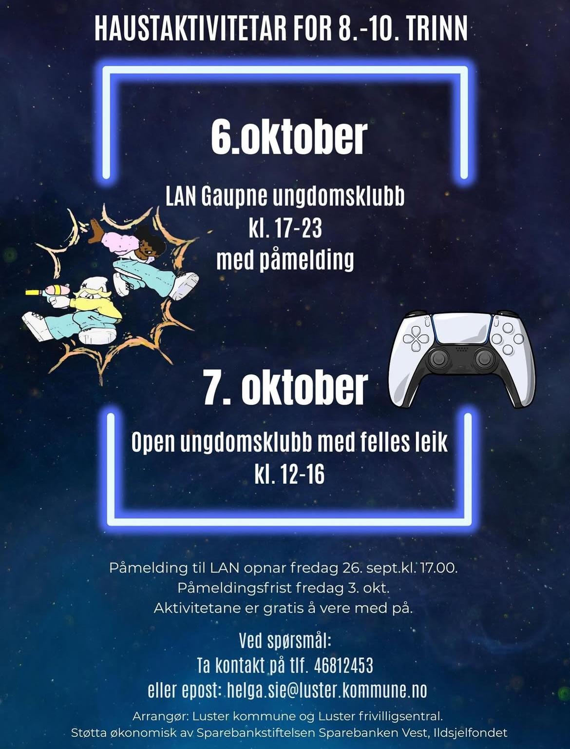 Luster kommune og Luster frivilligsentral samarbeider om å tilby gratis aktivitetar for barn/unge i haustferien. Sjå program for hausten 2025. Tilbodet er støtta økonomisk av Sparebankstiftelsen Sparebanken Vest Ildsjelfondet.Del på: